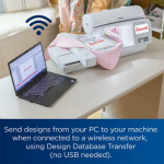 - Wireless capability The durable NQ1700E has wireless ability, so you can send designs from your PC to your machine when connected to a wireless network, using Design Database Transfer (no USB needed).