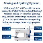 - Extra Large Workspace The PQ1600S features an expanded 11.1" x 23.3" wide table and a large 5.7" x 8.7" needle-to-arm space.